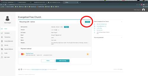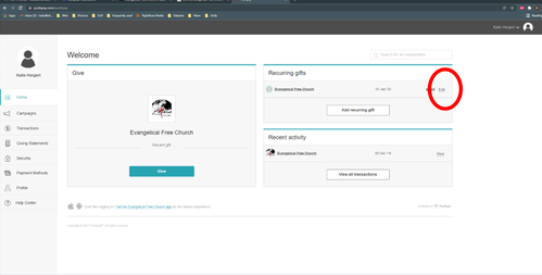 From your dashboard, find your "Recurring Gifts" section located on the right side, and click the "edit" link. (Circled in red)