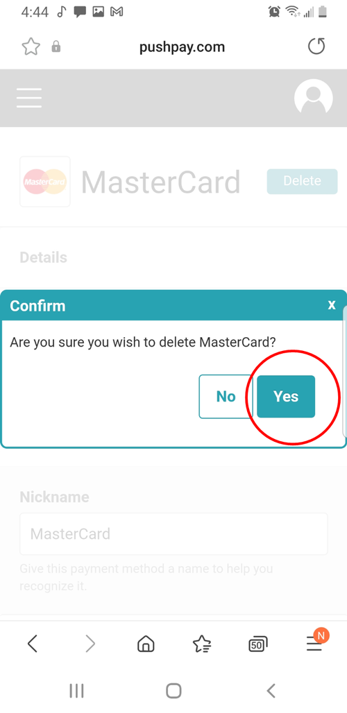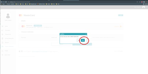 Click "yes" to confirm that you wish to delete the saved payment method.