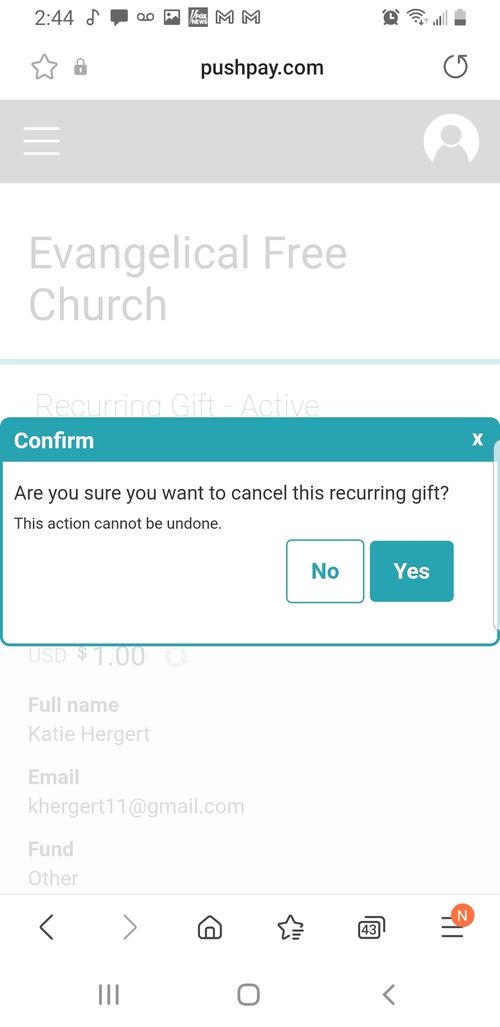 Touch "Yes" to confirm that you want to cancel your recurring gift.